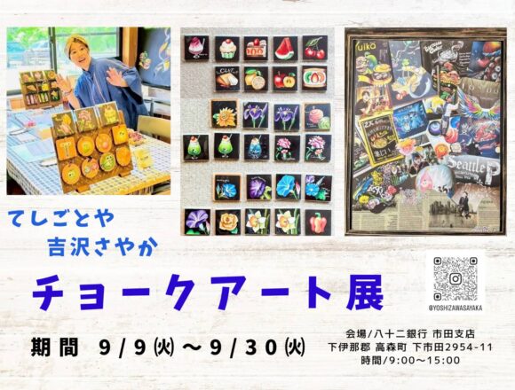 下伊那郡高森町下市田にある八十二銀行にて、【チョークアート展】開催します。…
